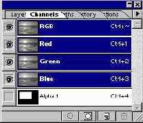 1. Щелкните на пиктограмме Save selection as channel в нижней части палитры каналов. В палитре Channels появился новый канал, который не имеет имени (Alphal): называйте его просто "первый альфа-канал". Следующий канал будет называться "второй альфа-канал" и т. д.