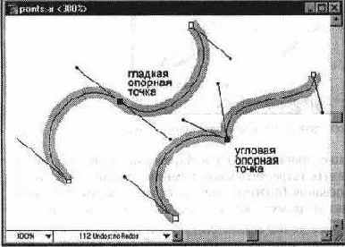 Опорная точка, без излома соединяющая две кривые, называется гладкой опорной точкой (smooth anchor point). Опорная точка, соединяющая две кривые «на изгиб», называется угловой опорной точкой (corner anchor point). При перемещении управляющей линии («рычага»), относящейся к гладкой опорной точке, изменяются обе кривые. А. при перемещении управляющей линии, относящейся к угловой опорной точке, изменяется только кривая, расположенная с той же стороны.
