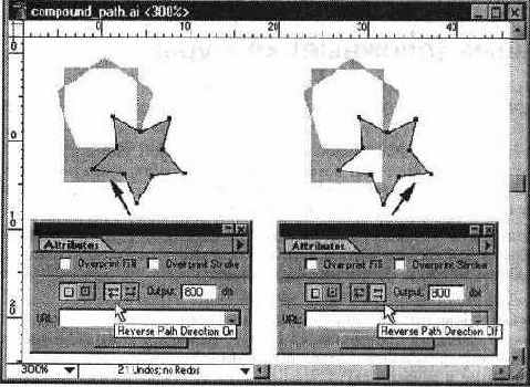 Если у простого контура, входящего в состав сложного, изменить направление вектора (ведь любой контур — это не что иное, как вектор, который характеризуется, помимо длины, направлением), то он меняет «свой вклад» в изображение на противоположный. Выполняется это следующим образом. С помощью инструмента Direct Selection (Частичное выделение) выделяется нужный простой контур в составе сложного. Затем выполняется команда Show Attributes (Показать атрибуты) меню Window (Окно), которая выводит на экран палитру Attributes (Атрибуты). В палитре Attributes (Атрибуты) представлены две кнопки, изменяющие направление вектора контура — Reverse Path Direction On (Обратное направление контура) и Reverse Path Direction Off (Прямое направление контура). С их помощью можно изменить направление вектора (Рисунок 7-45).